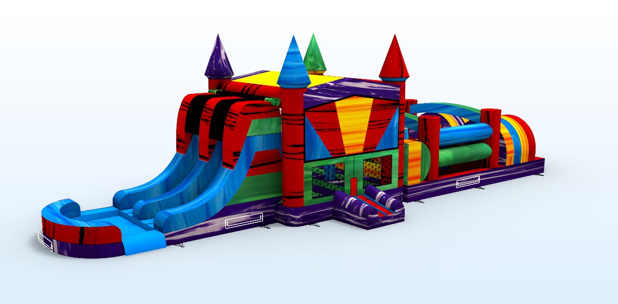 Get ready for non-stop fun with our brand-new 50ft Obstacle Course with Bounce House Combo! This massive inflatable is 50 feet long and 12 feet wide, packed with excitement from start to finish. It features double lanes and a double slide, so two participants can race side by side through all the obstacle challenges, pop-up pillars, tunnels, and bounce area — keeping everyone active and entertained.