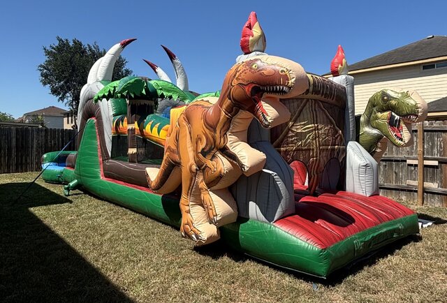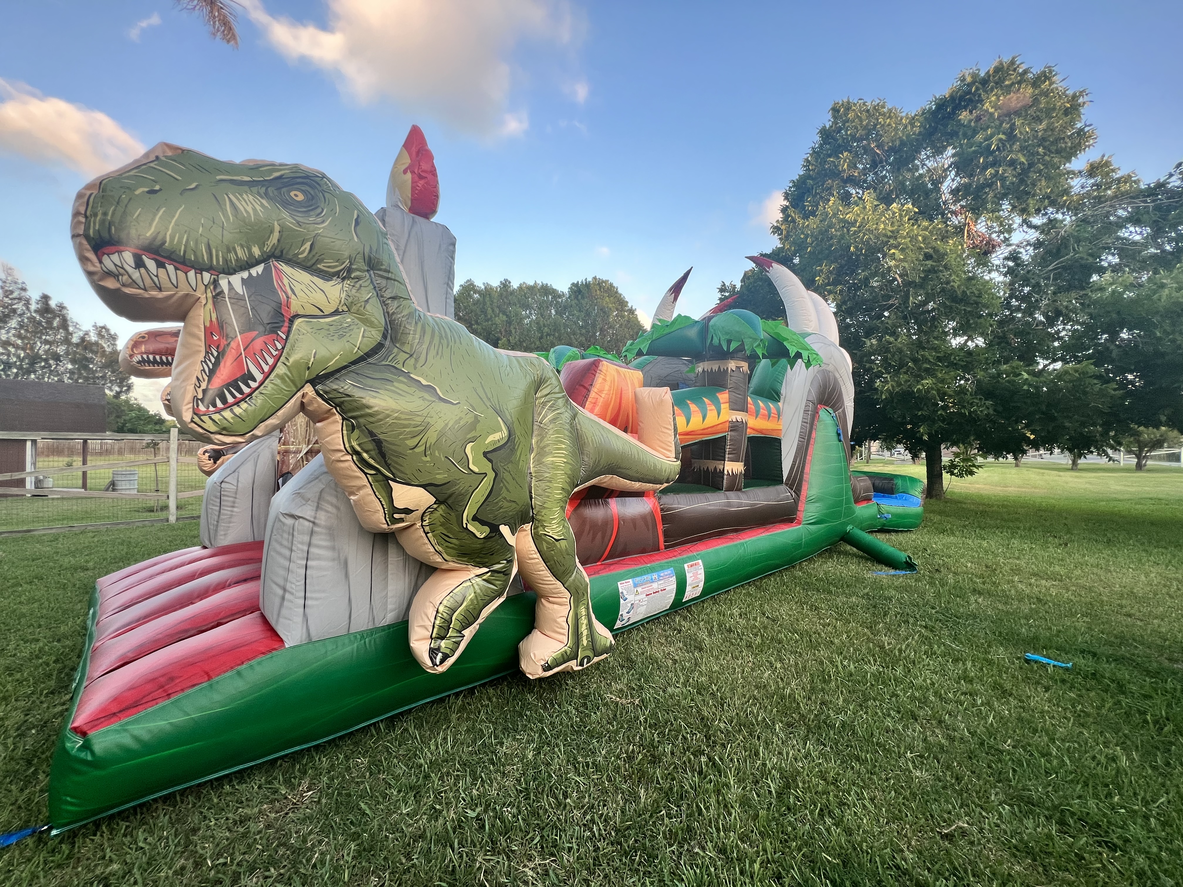 The Jurassic Adventure Obstacle Course, available for rent at $240.00, immerses participants in a thrilling wet adventure, taking them on a journey back to the time of dinosaurs. With dimensions measuring 36'L x 12'H x 10'W feet and requiring a setup area of 38'L x 14'H x 12'W feet, this water obstacle course promises excitement and aquatic fun. Participants can navigate their way through dinosaur-themed water obstacles, climb, slide, and conquer challenges while staying refreshed. With just one electrical outlet needed for setup, it's a fantastic choice for events that want to add a touch of prehistoric excitement. Ideal for birthday parties, school events, and gatherings that seek unforgettable, dino-sized aquatic fun.